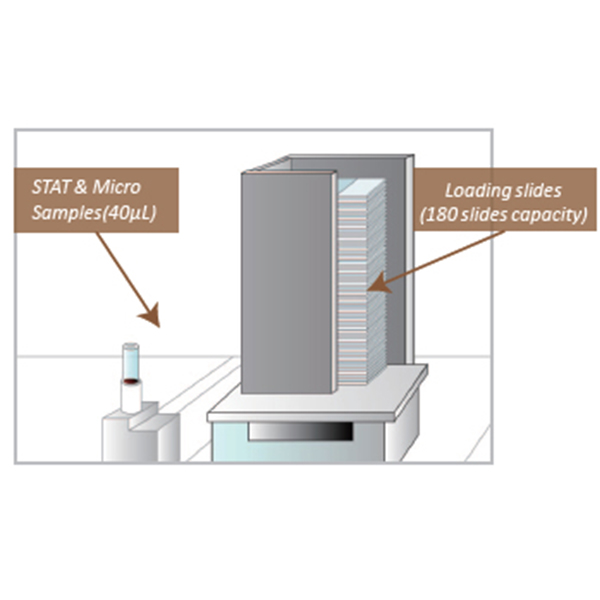 | Technology | Automated slide making & staining by single instrument Automated detection of blood consistency and automated adjustment of blood volume, angle & speed of spreader(or pusher) accordingly to optimize quality of smear (or blood film) |